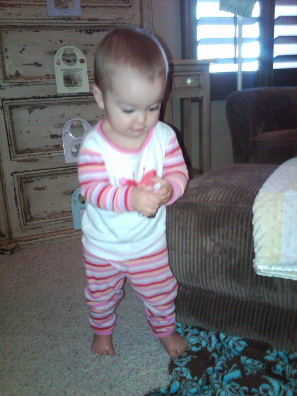 This is a typical attire in the morning for Miss Jaaten. We all the sudden don't like to wear shirts. I found out we HAVE to wear pants at all times though. The other day she pulled off her diaper while walking through the living room. Not good for The Mom!